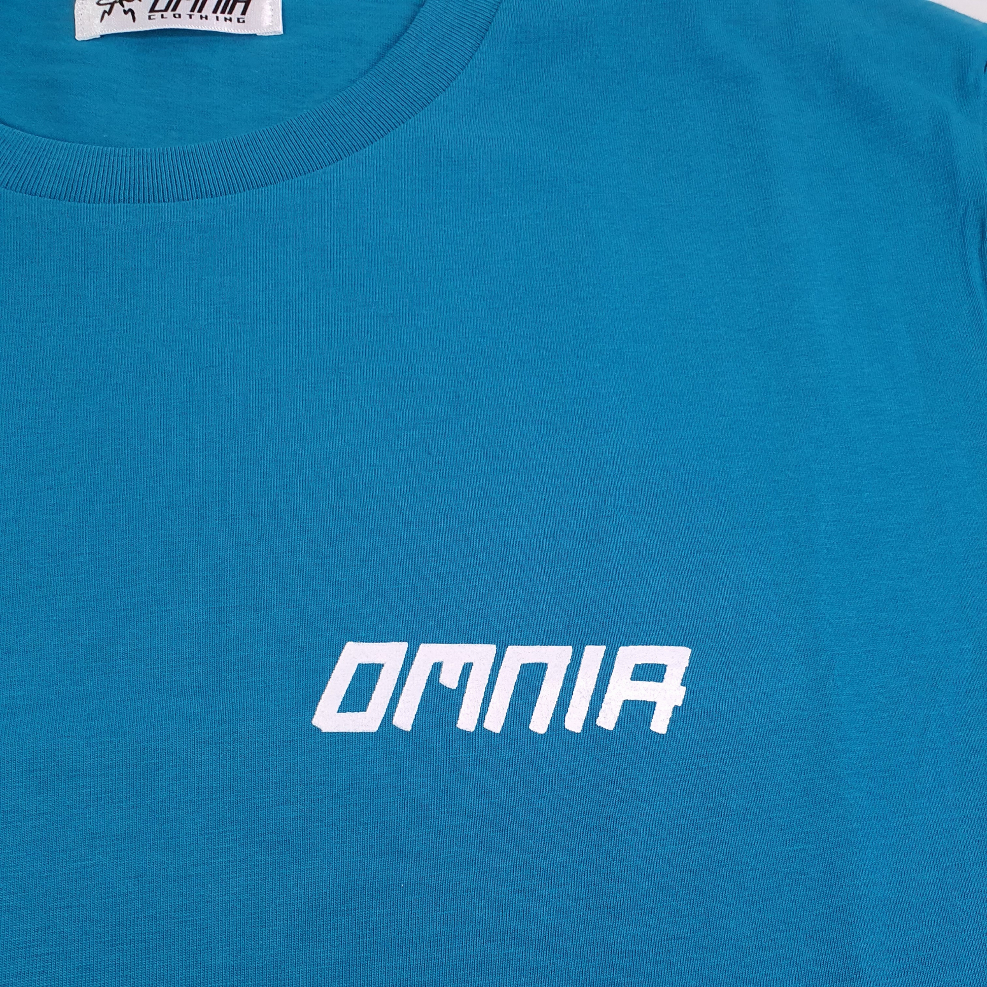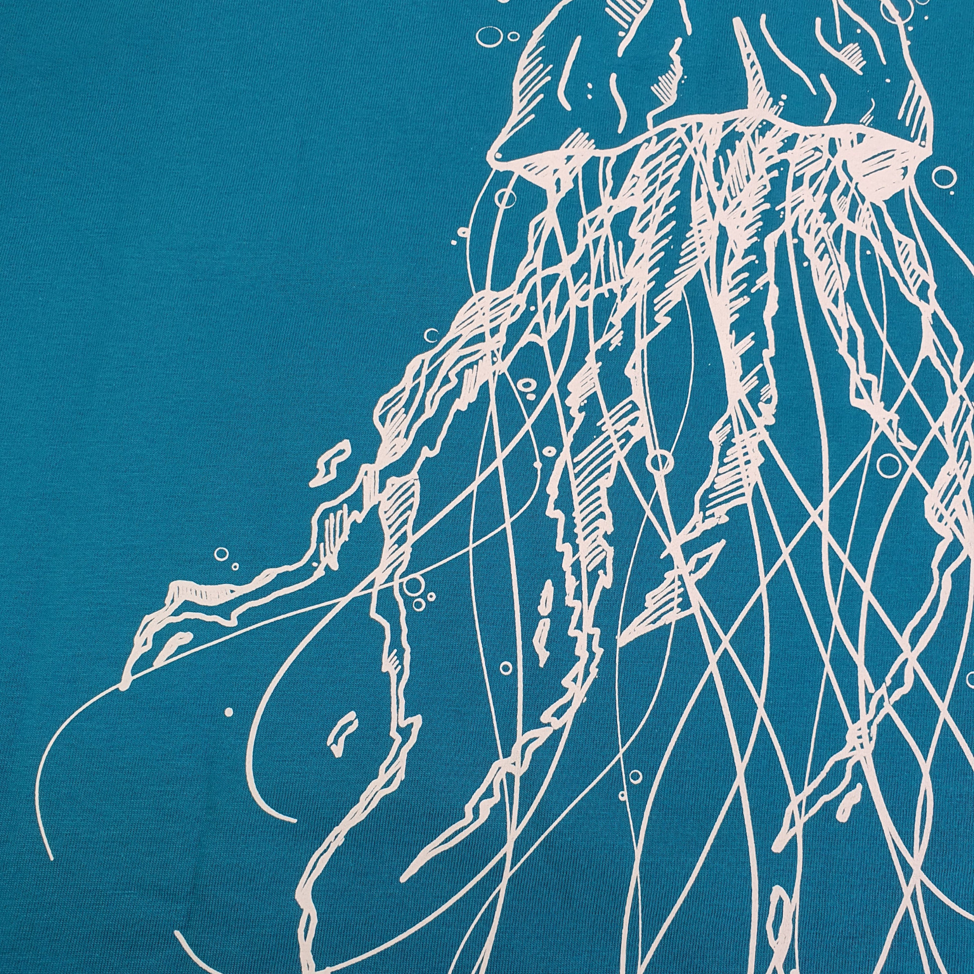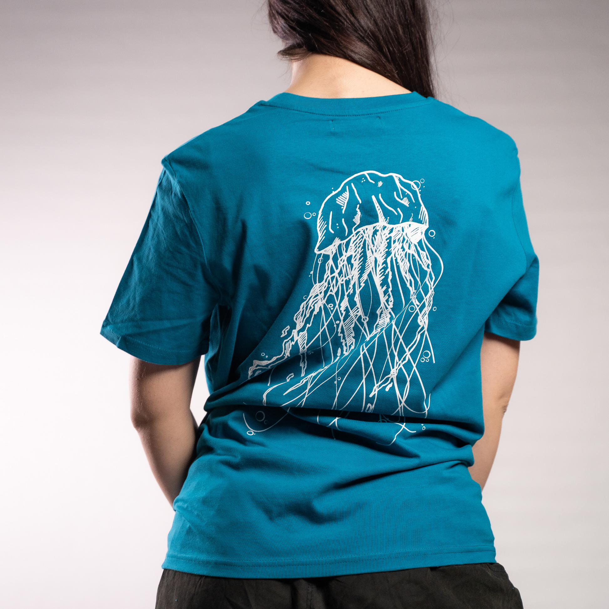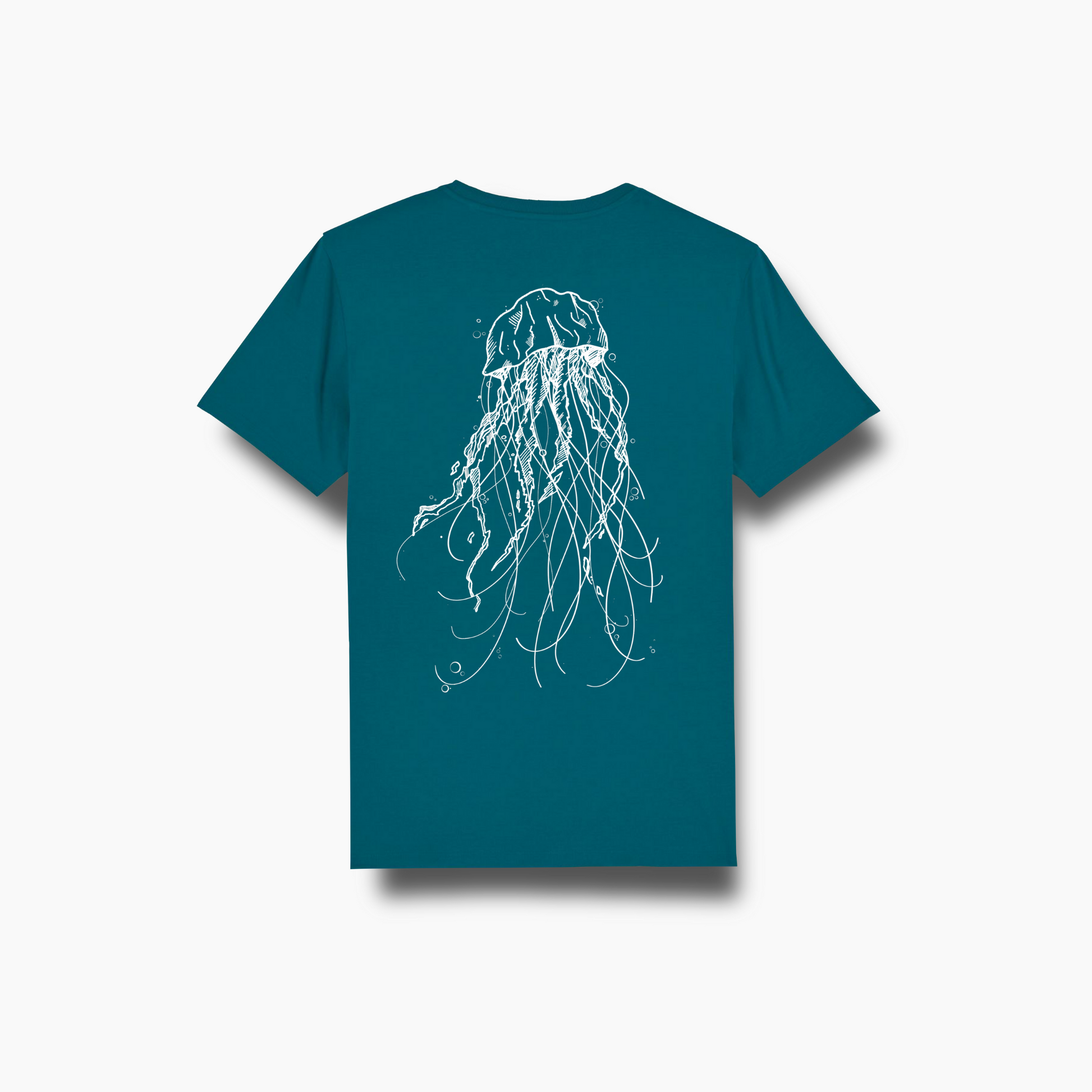 T-shirt del colore del mare con una medusa sul retro, una linea pensata nel rispetto della natura.